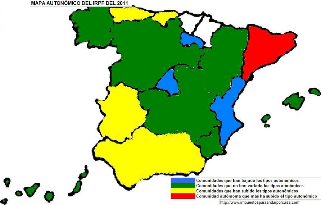 Por ello, y dado que no he encontrado en ningún “sitio” las tarifas generales agregadas de la Renta del 2011, es decir, una tabla única por comunidad donde tengamos el 50% de la parte estatal más el 50% de la autonómica, me he entretenido en elaborar unas de “andar por casa”, de modo que podáis ver como ha quedado el mapa autonómico de los tipos impositivos del IRPF para este año y sepáis en que tramo de renta os estáis moviendo según vuestro lugar de residencia.